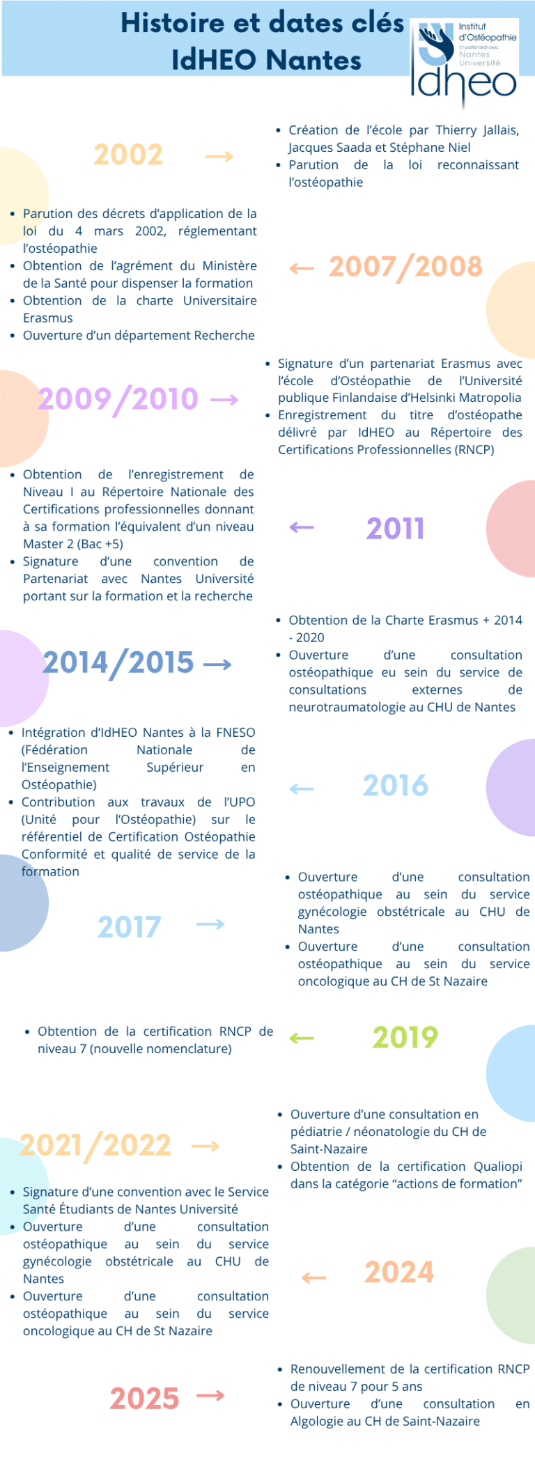 Le 30 août 2011, IdHEO et Nantes Université ont signé une convention de partenariat visant l’excellence dans la formation et la recherche en ostéopathie. Il en résulte une forte implication de Nantes Université dans l’enseignement fondamental et médical de la formation à l’ostéopathie. De même, de nombreux partenariats avec des laboratoires universitaires labellisés ont permis la mise en place de programmes de recherche prometteurs.